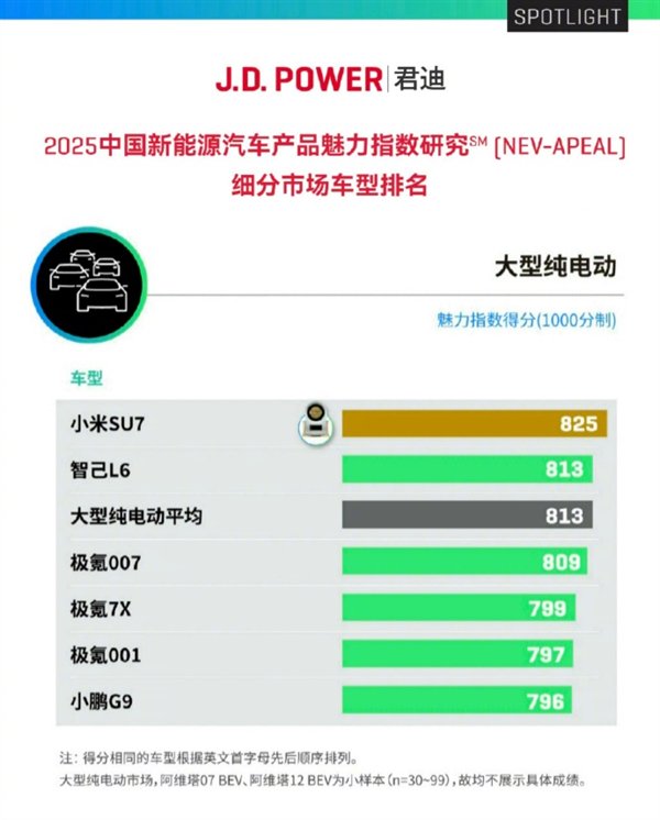快科技5月29日消息,今日,全球知名调研机构@JDPower君迪发布2025中国新能源汽车产品魅力指数研究,小米SU7以825分夺得大型纯电动车第一。