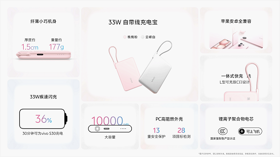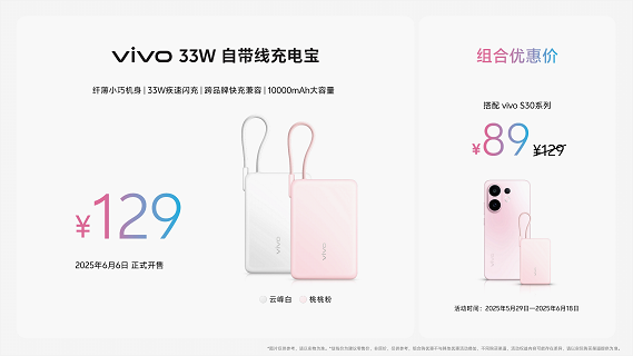 同时 vivo 10000mAh 33W 自带线充电宝正式发布,上市价格 129 元,6 月 6 日正式开售,6 月 18 日前搭配S30系列手机组合购买仅需 89 元。