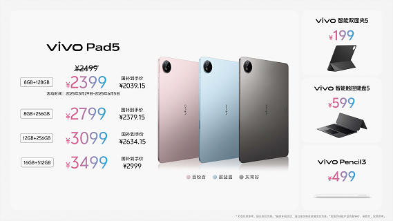 vivo Pad5 具有“展蓝图”、“灰常好”和“百粉百”三款配色,一体化轻薄金属机身仅重 590g,提供 8GB+128GB、8GB+256GB、12GB+256GB 和 16GB+512GB 四种存储组合可选,上市价格 2499 元起,叠加预售和国补优惠,仅需 2039.15 元起,现已开启预售,并将于 6 月 6 日正式开售。