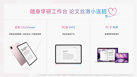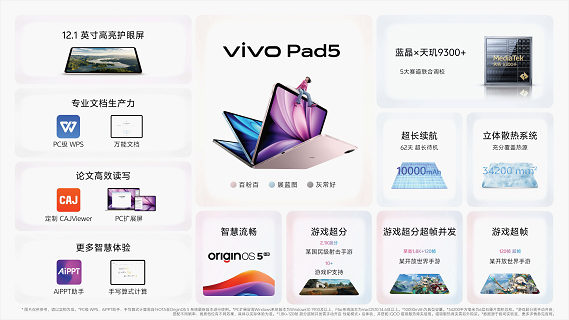 搭载全新 OriginOS 5 HD 的 vivo Pad5,更是你的学习好帮手,以 PC级 WPS、CAJViewer 安卓定制版和万能文档组成专业文档生产力,助力用户的学习效率大幅提升;拥有系统级蓝心大模型 AI,带来小 V 写作、小 V 帮记、小 V 圈搜和可以一句话自动生成精美 PPT 的 AiPPT 助手,让用户体验智慧 AI 带来的便利生产力;蓝心小 V 接入 DeepSeek-R1,支持深度思考和联网搜索,让用户更轻松获得所需答案。