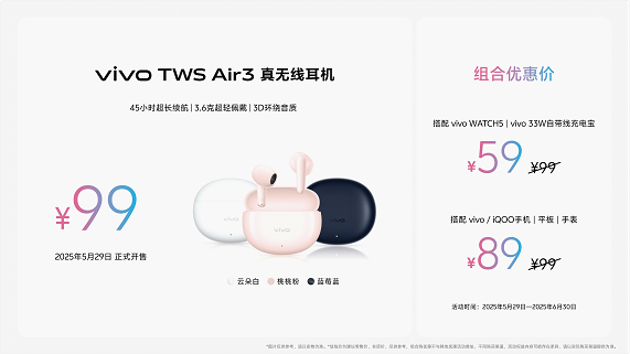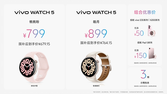 vivo TWS Air3 具有“桃桃粉”、“云朵白”和“蓝莓蓝”三款配色,上市价格 99 元,现已全面开售。此外 vivo WATCH 5 “桃桃粉”新配色全新上市,上市价格 799 元起,国补后仅需 679.15 元起,现已全面开售,6 月 30 日前购买,还可享 3 期分期免息。