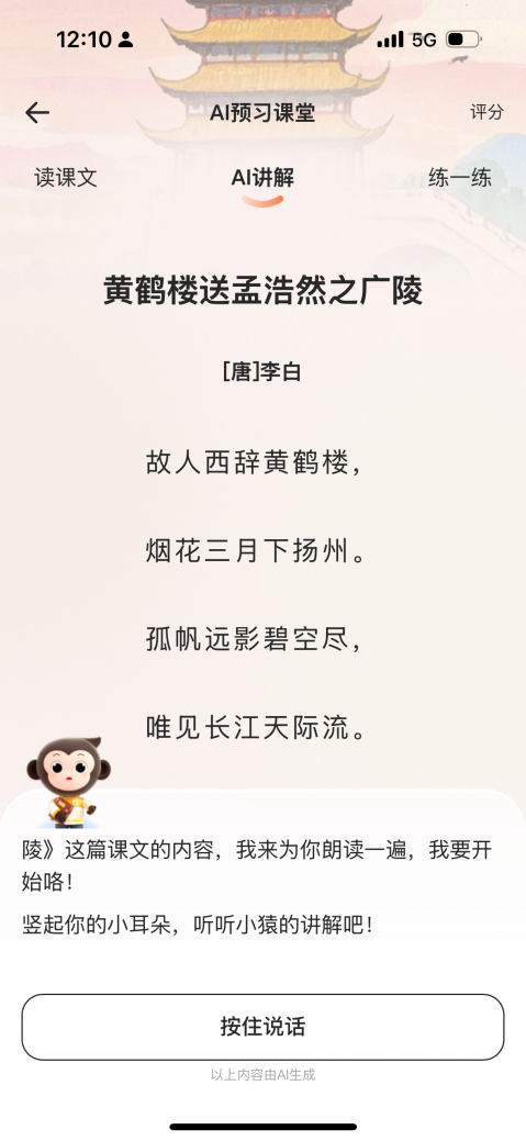 传统语文教学常聚焦字词解释与段落分析,而小猿 AI 的 “互动预习” 功能则以新课标要求的“语言建构与运用、思维发展与提升、审美鉴赏与创造、文化传承与理解” 四大核心素养为设计原点。通过情境式互动模块,将课文背后的历史脉络与作者生平转化为趣味故事。例如讲解诗词《送孟浩然之广陵》时,AI 会以生动的语言还原诗词的时代背景,引导学生理解李白送别好友的复杂心境。逐句拆解文本时嵌入实时互动提问,如 “孤帆远影碧空尽”表现了作者怎样的情感,助力孩子逐句理解诗词的语言建构与运用,提升孩子主动思辨能力,强化审美鉴赏与创造,实现文化传承与理解。