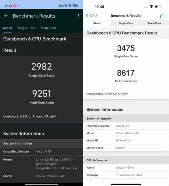在反映CPU性能的GeekBench 6测试中,小米15S Pro的单核跑分成绩为2982分,多核成绩9251分;iPhone 16 Pro Max的单核跑分成绩3475分,多核成绩8617分。从成绩上可以看出,iPhone 16 Pro Max单核成绩更优,但玄戒O1在多核成绩上占据优势。
