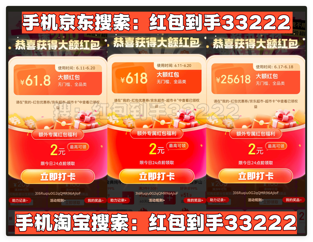 首先,划重点!今年天猫/淘宝和京东的618红包口令都是「红包到手33222」要记住!领的红包大小和你搜索的什么口令有关的!这个双平台通用口令包领到大的!记得每天去领!
