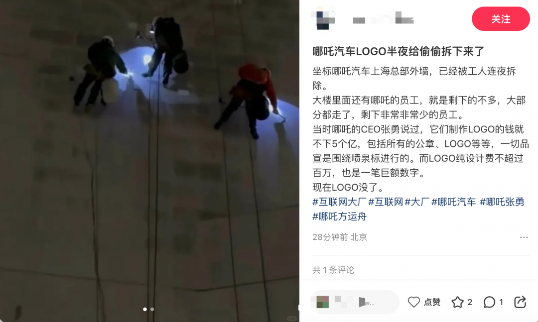网友称哪吒汽车上海总部LOGO被连夜拆除