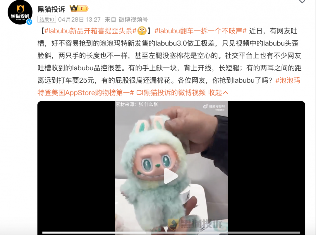 泡泡玛特发布的Labubu第三代搪胶毛绒产品风靡全球,不少玩家反映“一娃难求”。但在社交平台,有不少消费者表示,自己买的娃娃出现了歪头、开线、掉漆、秃毛等品控问题。据黑猫投诉 【下载黑猫投诉客户端】平台分享的案例,有网友称,好不容易抢到的泡泡玛特新发售的labubu3.0做工极差,头歪脸斜,两只手的长度也不一样,甚至左腿没塞棉花是空心的。