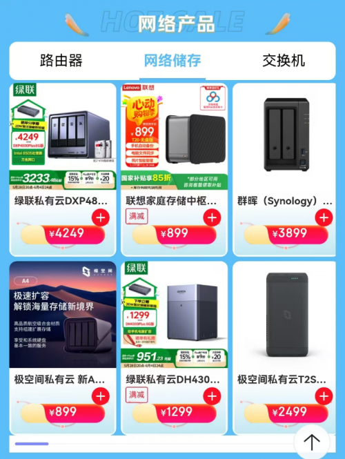 路由器、网络储存等产品也可享西安消费券优惠,其中普联企业级路由器AX3000享西安消费券后到手价649元;联想家庭存储中枢T20无盘版享西安消费券后到手价799元;群晖DS723+网络存储服务器享西安消费券后到手价3699元,下单更省钱。