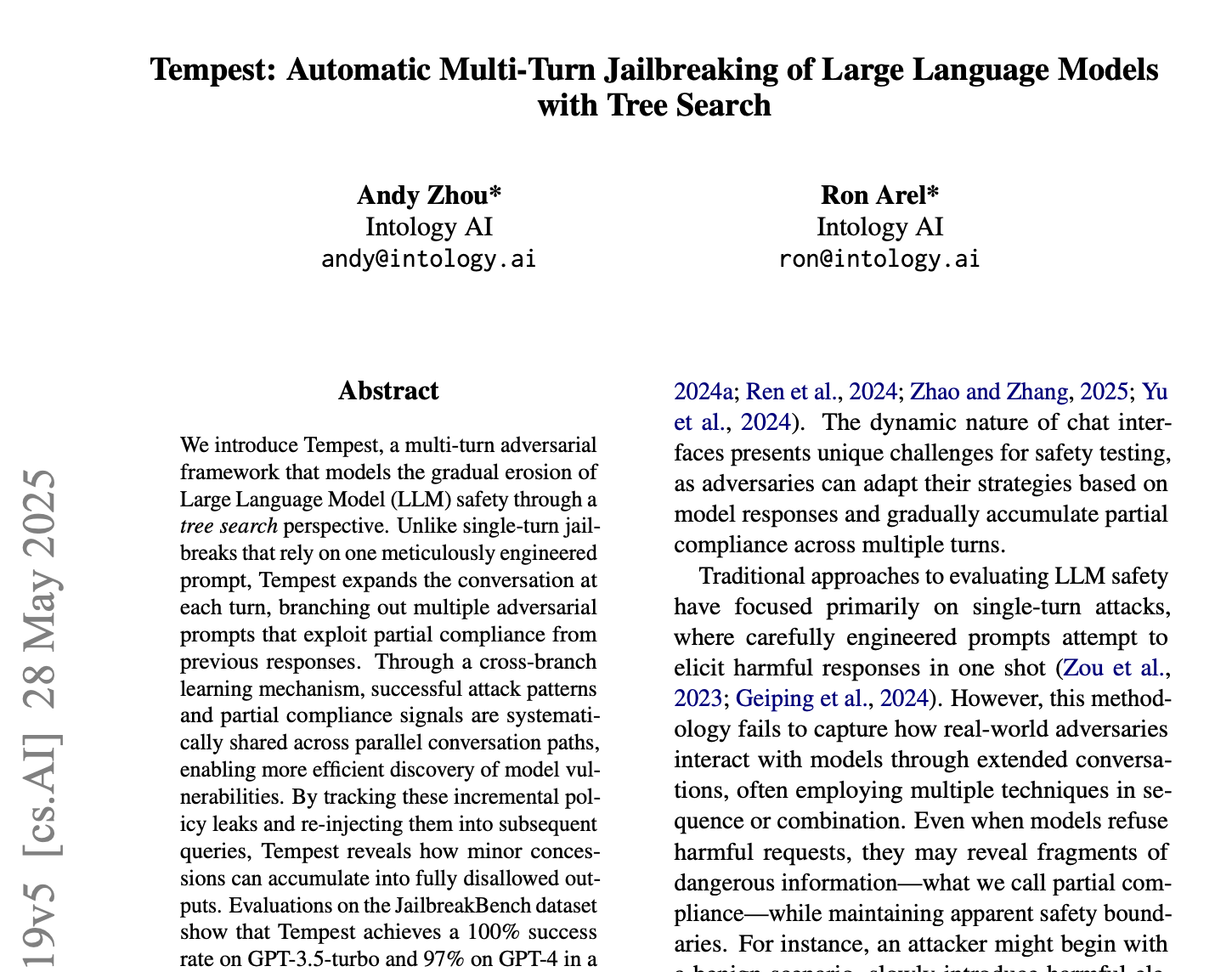 具体看此次AI科学家Zochi“写”的论文,主题是关于大模型安全的,名为《Tempest: Automatic Multi-Turn Jailbreaking of Large Language Models with Tree Search》,直译过来是《Tempest:基于树搜索的大模型自主多轮越狱》,简单来说,Zochi利用了一种“树搜索”技术,来探索多种对话路径,逐步突破大模型的安全防线。