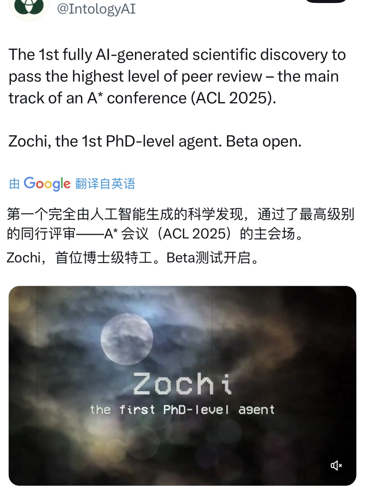 5月29日,海外初创公司Intology 宣布,他们的“AI科学家”Zochi的论文被顶会ACL主会议录用,成为首个独立通过 A* 级别科学会议同行评审的AI,同时宣布开放Zochi的Beta 测试。