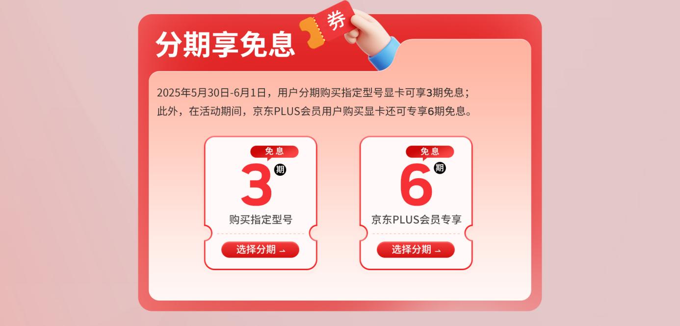 特别提醒:在2025年5月30日20:00-6月1日23:59期间,用户分期购买指定型号显卡可享3期免息!此外,在整个618活动期间,京东PLUS会员用户购买显卡还可专享6期免息!这绝对是升级装备的绝佳时机,让高性能显卡不再遥不可及。