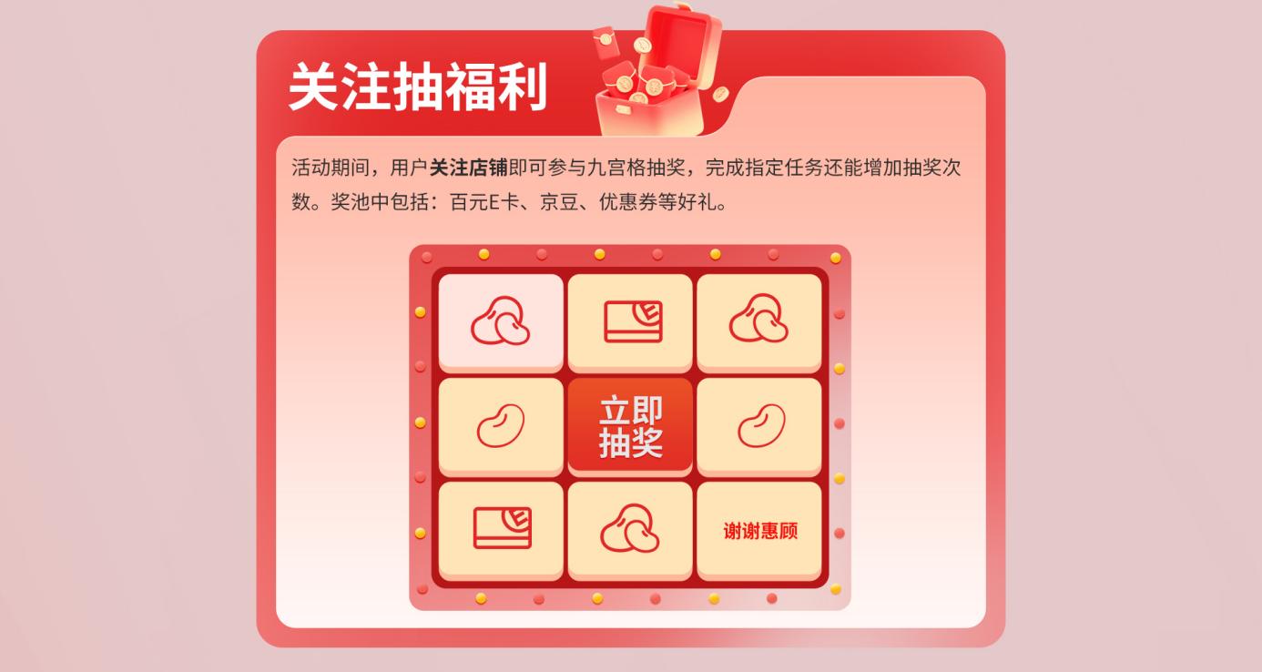 此外,在活动期间,用户仅需关注店铺,就可参与九宫格抽奖,有机会获得百元E卡、京豆、优惠券等好礼。想要增加抽奖次数的用户可以通过完成指定任务获取。机会难得,快来试试你的手气吧,说不定幸运的就是你!