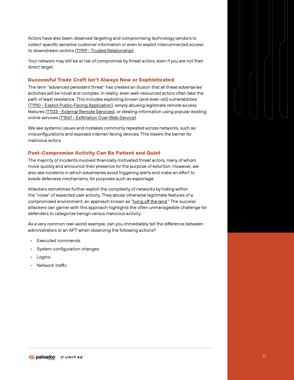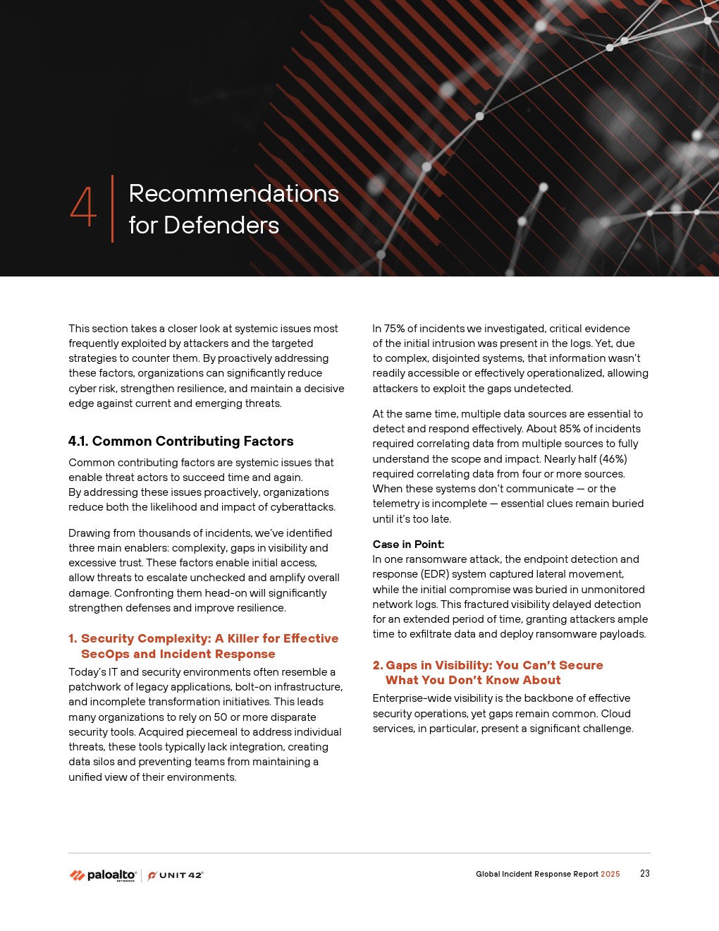 基于多年的经验和数千次事件响应,我们确定了使对手成功的三个核心因素:复杂性、可见性差距和过度信任。分散的安全架构、未管理的资产和过度宽松的账户都为攻击者提供了成功所需的空间。