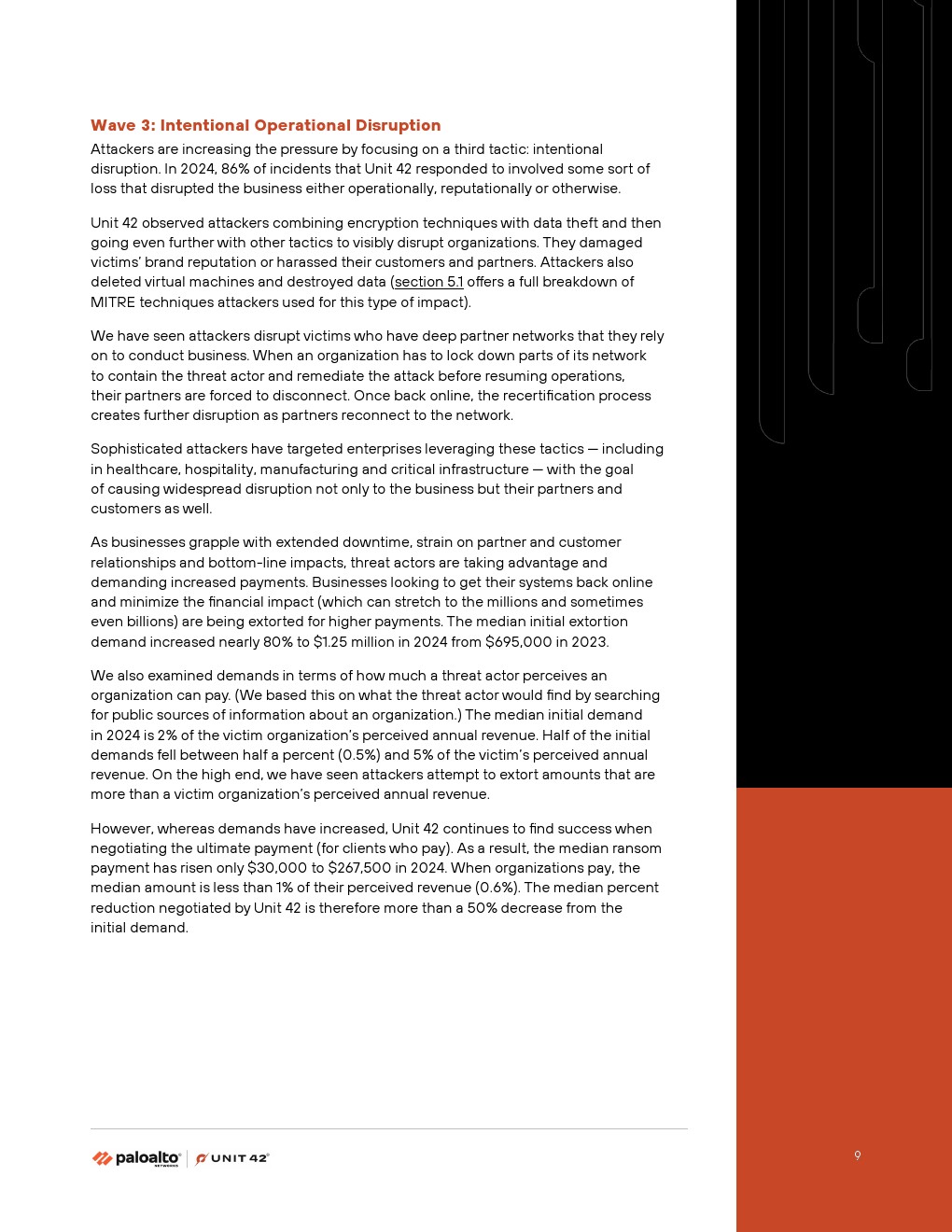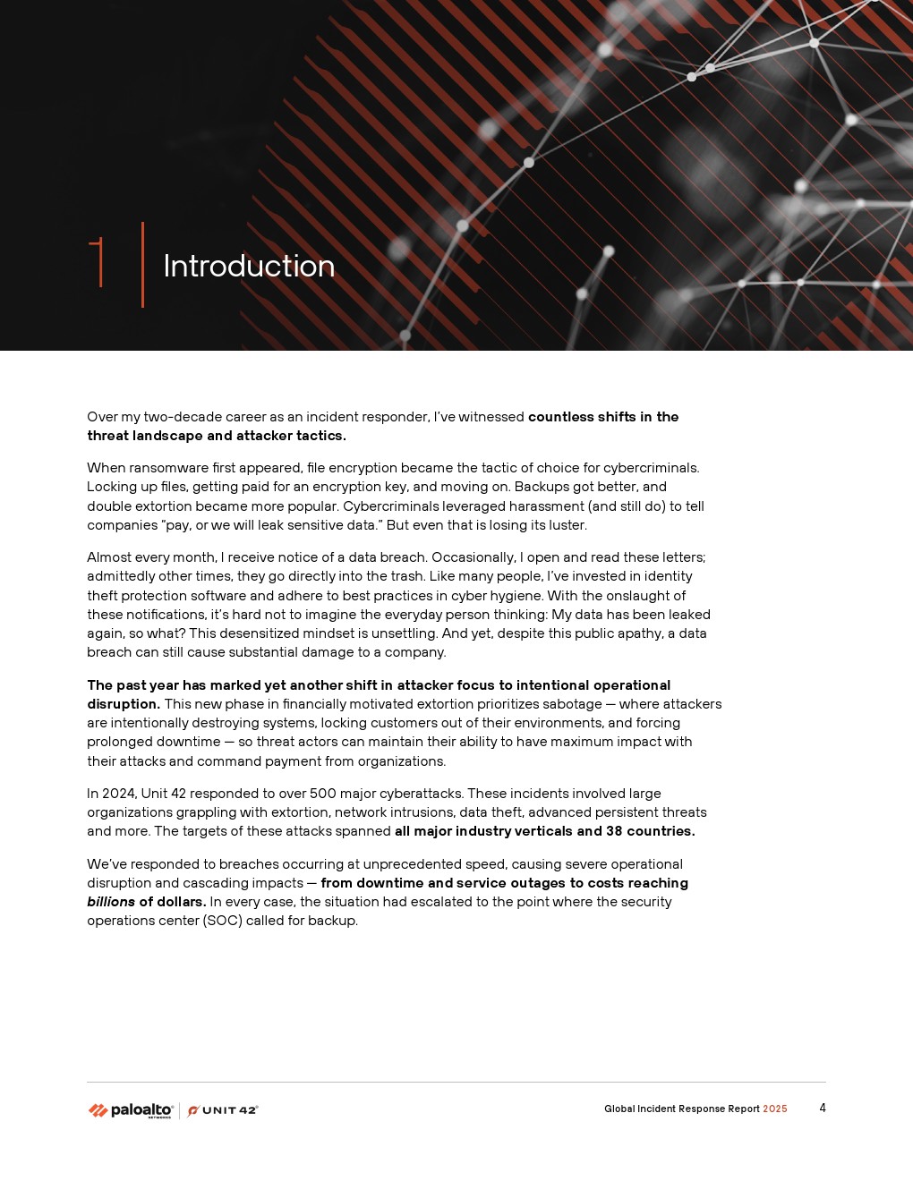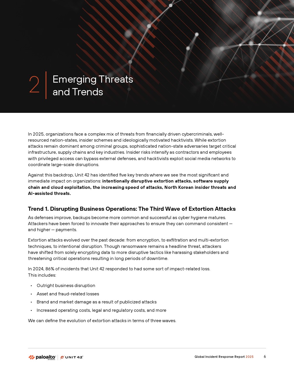 首先,威胁行为者正在通过故意破坏运营的攻击来增强传统的勒索软件和敲诈手段。2024年,Unit 42响应的事件中有86%涉及业务中断——包括运营停机、声誉损害或两者兼有。