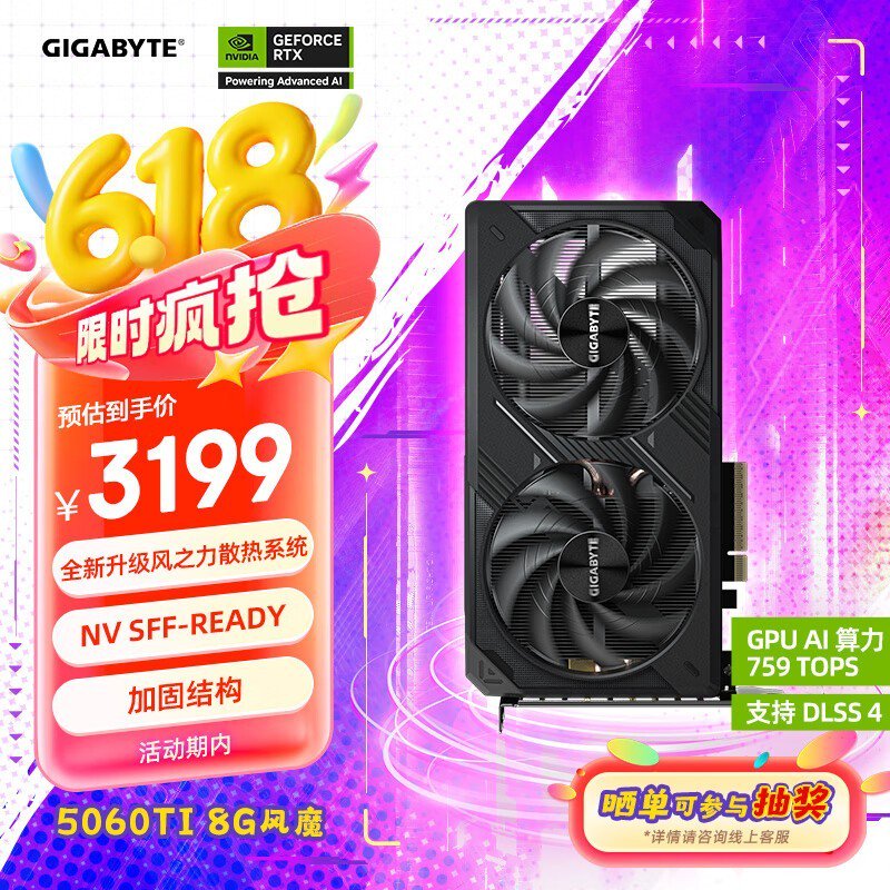 技嘉RTX 5060Ti 8G显卡京东优惠价3183元