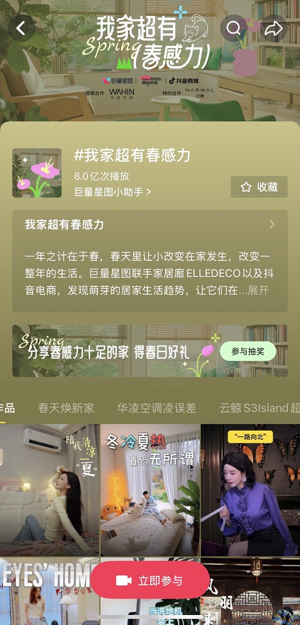 当然,适配的季节趋势和情绪海报只是基础,想要充分引动营销势能,加速品牌破圈传播,能够迅速引起受众情感共鸣的优质内容同样必不可少。为了持续发酵活动热度,巨量星图一方面将春感力与家电深度融合,打造IP主话题#我家超有春感力,邀约多元达人围绕春日三大趋势输出家电家装体验与风格灵感等优质内容,为话题持续加热,引领全平台用户参与,收获8亿次播放。