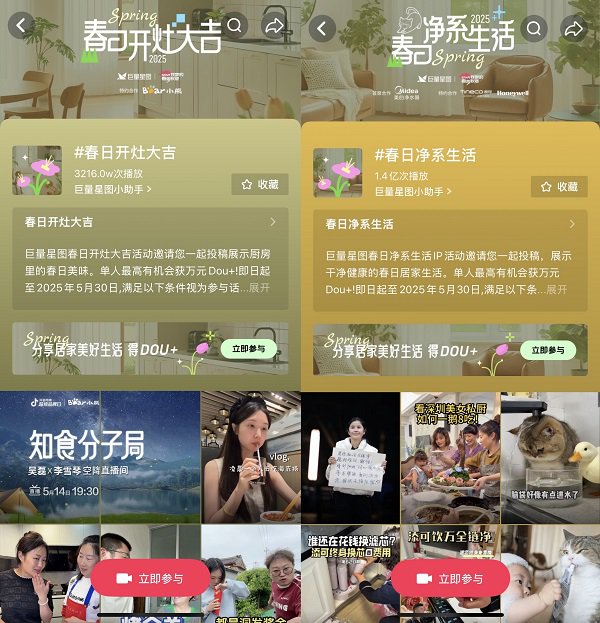 另一方面,巨量星图聚焦厨房电器和两净电器的细分品类打造IP子话题 #春日开灶大吉、#春日净系生活,将不同品牌、不同品类的产品汇聚一堂,开辟平台和品牌合作的新尝试,帮助品牌以更聚焦的场景覆盖多圈层、多消费层级用户。活动期间,话题累计曝光1.61亿+,通过立体化的热点打造和三大话题的合力,巨量星图持续聚拢用户对品牌及活动的关注度,实现“深度种草+广度传播”的叠加效应,为趋势构建起立体且长效的影响力。