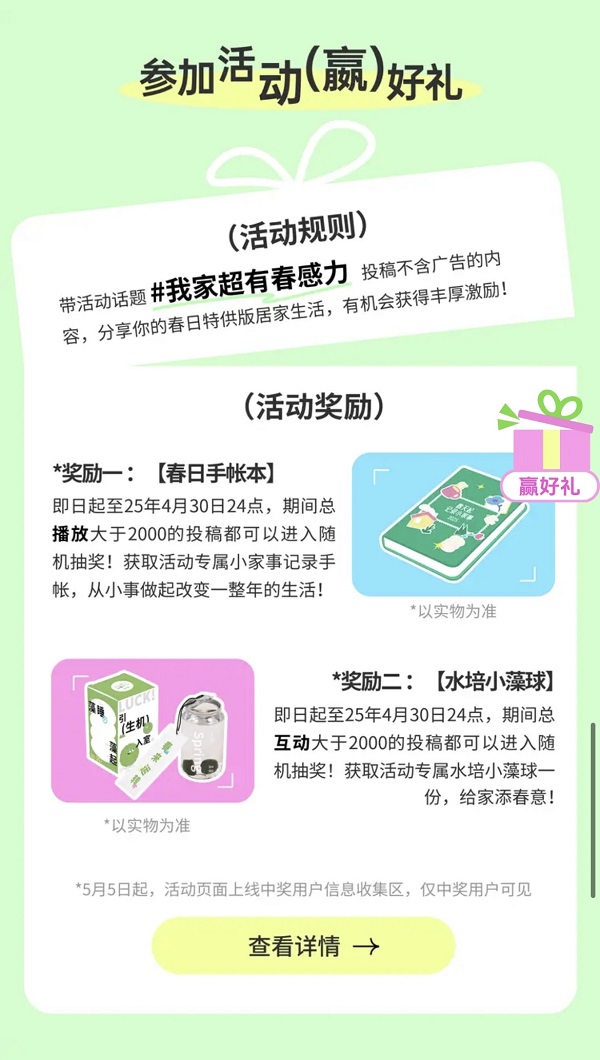 除了话题生态的打造,在话题爆发期,为了进一步扩大种草场景,活动还通过沉浸式内容设计主题H5、参与互动抽水培小藻球、春日手帐等多种玩法,巧妙串联起话题和产品信息,扩充#我家超有春感力 的大众化展示面,激发更多达人和用户参与话题创作,进一步提升了用户的的体验感。同时利用抖音开屏页等优质资源广泛触达人群,通过“产品信息+使用场景”的曝光降低用户决策成本,实现“内容兴趣-即时转化”的高效闭环。
