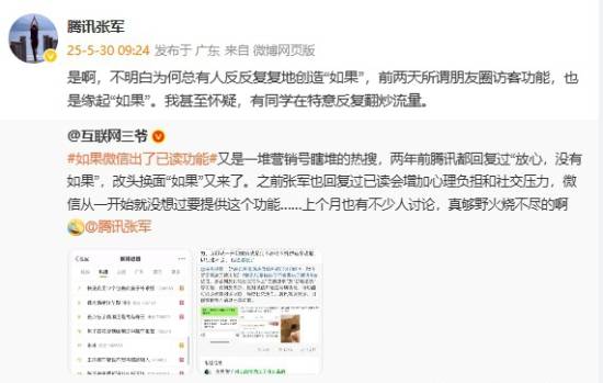 5月30日,腾讯公司公关总监张军在社交媒体上转发了关于“如果微信推出已读功能”的话题,并发表评论称:“这种假设性的问题一直存在,比如前两天热议的朋友圈访客功能,也是类似的逻辑。我甚至怀疑,有人故意反复炒作这类话题来获取流量。”
