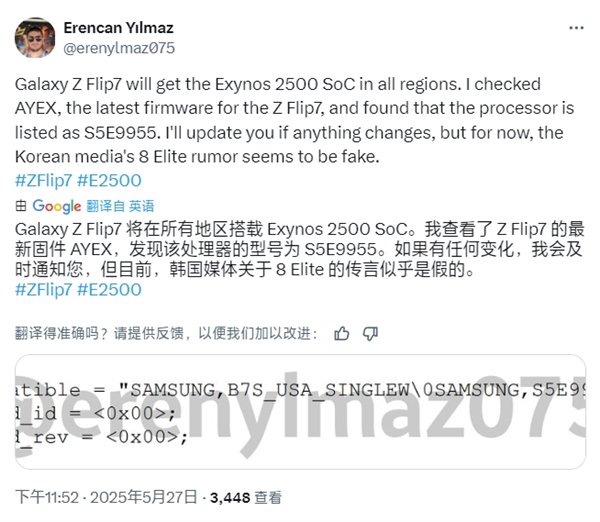 快科技5月30日消息,据爆料者Erencan Yılmaz介绍,三星Galaxy Z Flip7将全球统一配置,全部搭载自家的Exynos 2500芯片。