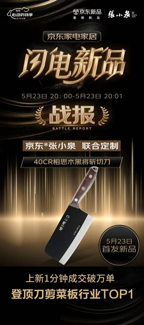 京东定制张小泉黑将斩切刀选用40Cr13优质钢材,锋利升级,特殊黑刃防锈处理,不易生锈更持久,搭配天然相思木手柄,防滑且握感更舒适,刀背经过圆润打磨,长时间切菜也不累手。作为京东家电家居的闪电新品,这款刀具上市即引爆市场,5月23日首发上线1分钟即破万单,当日售罄并登顶京东刀剪菜板品类销量榜首,热销态势促使品牌紧急调动内部产能,追加15万把生产订单。京东618期间,这款斩切刀多重优惠叠加后到手价仅67元,堪称年度最值得入手的厨房神器。