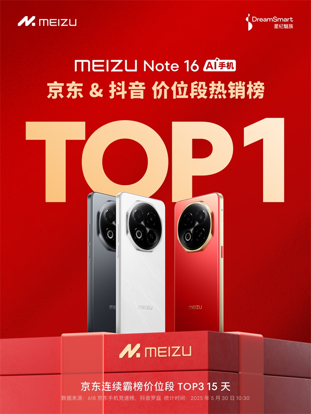 而市场对于魅族 Note 16 补货开售的反响依旧非常热烈。据京东手机竞速排行榜显示,魅族 Note 16 在 500 - 999 元当日榜中再度斩获 TOP1,并连续霸榜价位段TOP3长达15天;而在抖音 400 - 900 元价位段,魅族 Note 16 也强势登顶 TOP1,成为当之无愧的销量冠军。