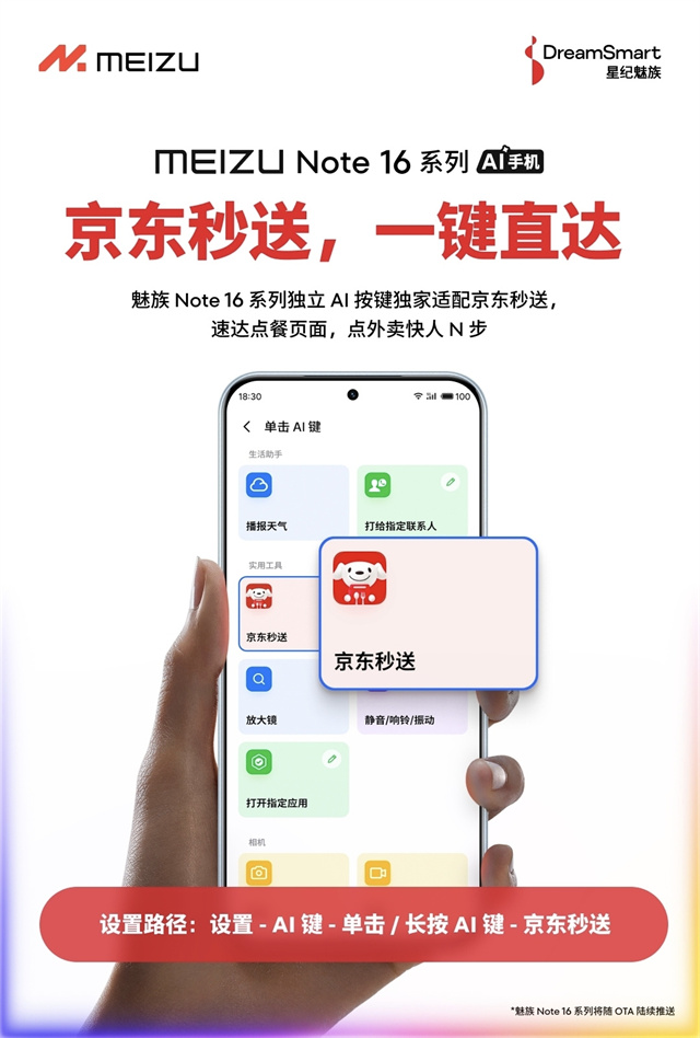 此前,魅族Note 16系列的一键AI助力抢单功能广受京东外卖骑手的好评。而这一次,以“AI平权”为产品理念的魅族Note 16系列又带来了京东秒送的便捷功能:独立 AI 按键独家适配京东秒送,用户只需单击或长按 AI 键,即可一键直达点餐页面,点外卖快人N步!这一功能将随着 OTA 推送陆续上线,为用户的生活带来更多便利。