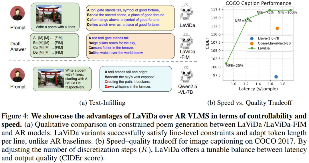 图 4a 展示了有约束诗歌生成的定性结果,其中模型需要生成一首描述图像的诗歌,并且每行要以特定的音节开头。与自回归模型不同,LaViDa 和 LaViDa-FIM 都成功完成了任务。值得注意的是,LaViDa-FIM 会动态调整每行的 token 数量。