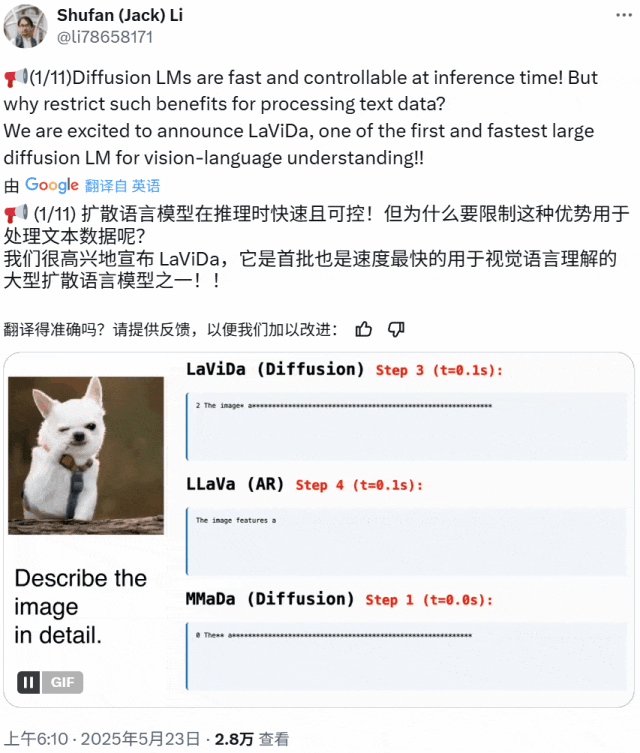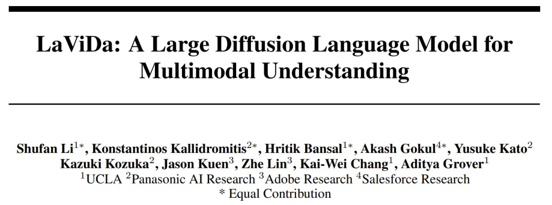 该模型来自加利福尼亚大学洛杉矶分校、松下、Adobe 和 Salesforce,算得上是首批基于扩散的 VLM 之一,我们之前还报道过的另外几个多模态的扩散语言模型可供对照: