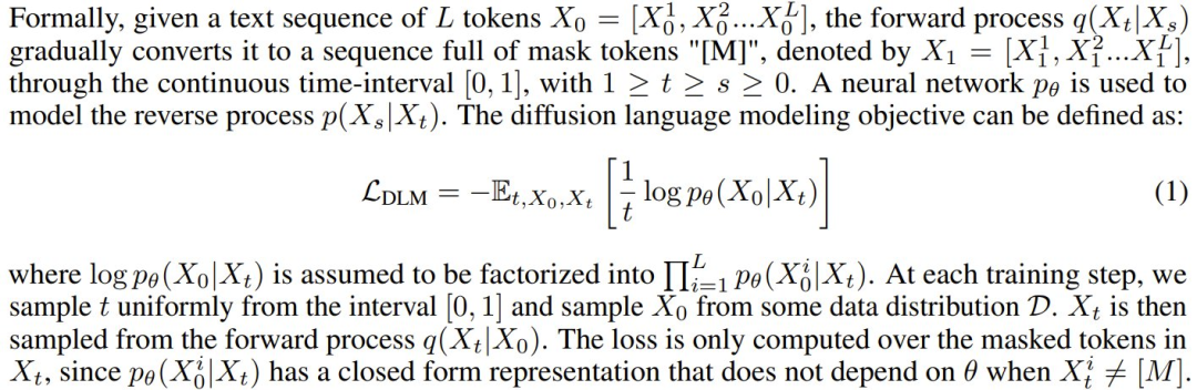 扩散语言模型:这里的扩散语言模型是一个多层 Transformer,其架构与 LLM 类似。唯一的主要区别是:它的注意力掩码是非因果式的,并且它使用的建模目标是如下扩散语言建模目标,而不是自回归模型使用的下一个 token 预测。