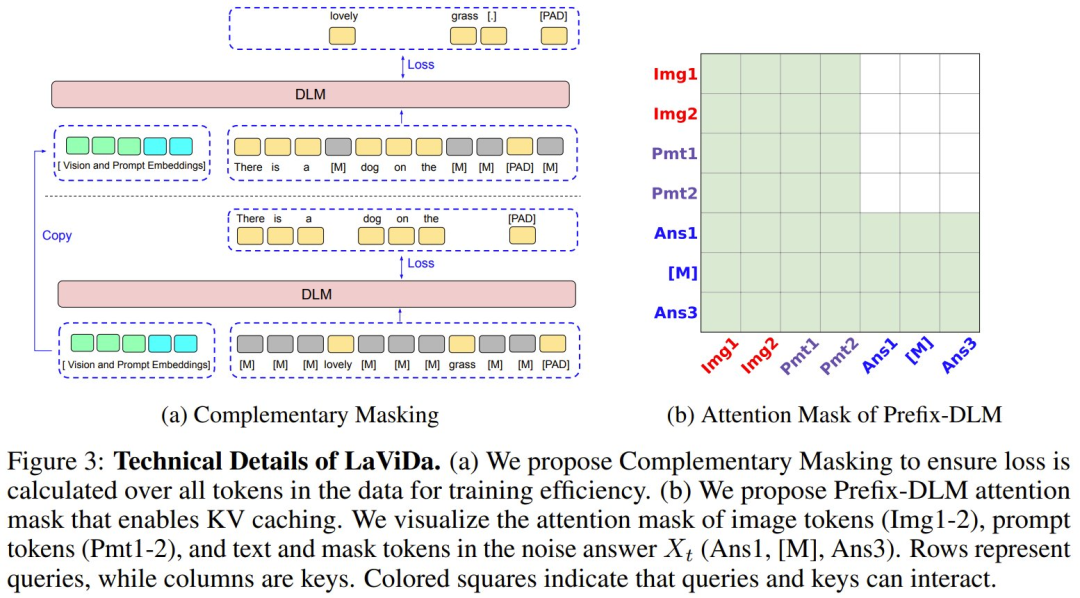 下图展示了 LaViDa 的更多技术细节,而有关其训练算法和推理算法的更详细描述请参阅原论文。