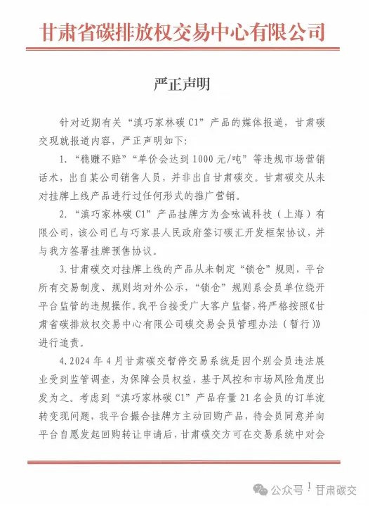 声明称,“甘肃碳交”对挂牌上线的产品从未制定“锁仓”规则,平台所有交易制度、规则均对外公示,“锁仓”规则系会员单位绕开平台监管的违规操作。平台接受广大客户监督,将严格按照《甘肃省碳排放权交易中心有限公司碳交易会员管理办法(暂行)》进行追责。