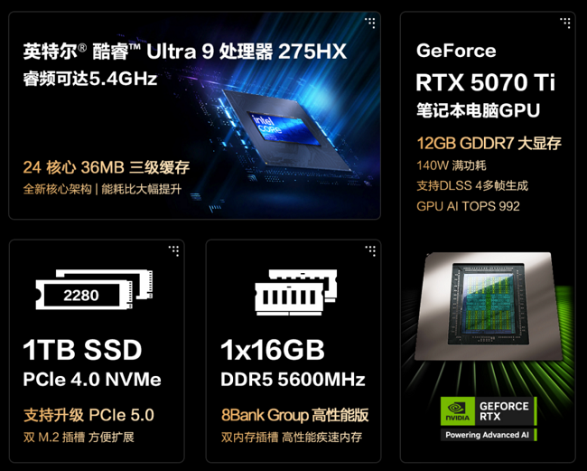 ROG枪神9 Plus电竞本凭借硬核高性能配置,为《燕云十六声》的武侠开放世界提供极致体验。搭载英特尔酷睿Ultra 9 275HX处理器(24核24线程,5.4GHz睿频)与140W满功耗RTX 5070Ti笔记本电脑GPU,支持DLSS 4与光线追踪,轻松驾驭游戏内竹林光影、千人同屏的市井场景及复杂的地下暗渠渲染。