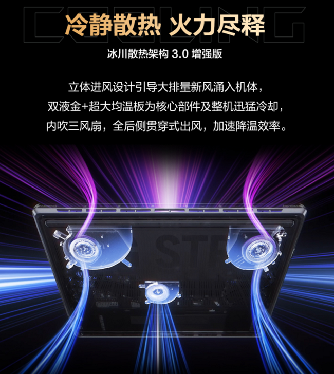 散热方面,冰川散热架构3.0增强版采用三风扇内吹设计,CPU与GPU覆盖定制第二代暴力熊液金,内置超大面积的端到端均温板,采用立体式进风+后出风设计,出风口处散热鳍片特殊处理,三明治结构有效增大热交换面积,提升了散热模组的散热效率。冰川散热架构3.0增强版可为玩家带来稳定、静谧的用机体验,确保长时间探索燕云世界时稳定控温。