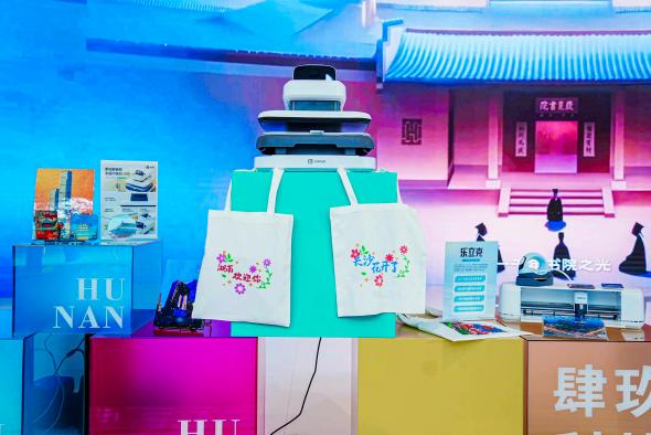 在湖南馆内,乐立克打造的沉浸式互动体验空间成为展馆焦点。通过刻字机、烫画机等 DIY 智能设备,参观者可亲手制作潮流文化周边创作。从定制个性潮流服饰、文创帆布包,到设计专属帽子、杯子、拼图、贴纸等,全程体验“科技让文化变好玩”的创新魅力。
