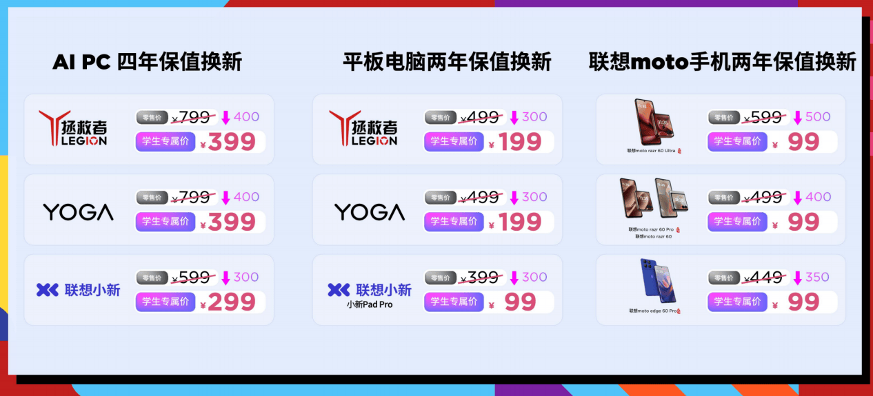 除了单品低至9折的超值优惠,联想还为“脆皮”大学生们推出了专属的保值换新优惠政策,为大学生们的设备保驾护航。购买此项服务,立享300-500优惠。比如购买AI PC享受2年保值6折、4年保值5折;购买平板电脑享受1年保值6折、2年保值5折;购买联想moto手机则享受1年保值6 折、2年保值5折的超值福利,大学生们再无需担忧设备贬值,随用随换新。