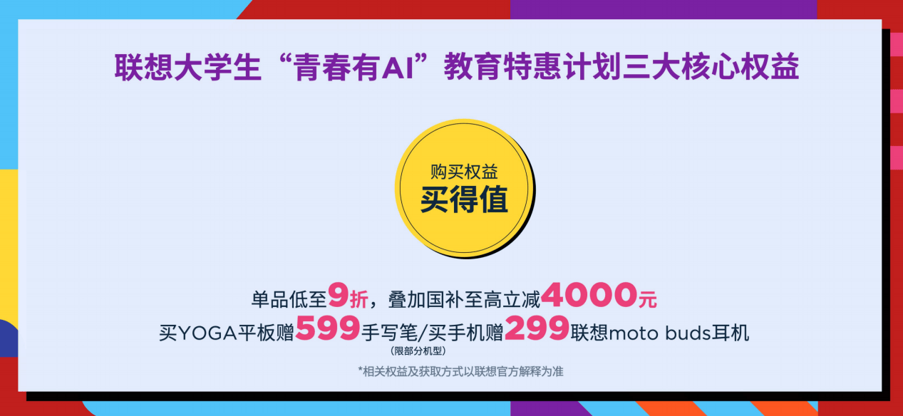联想一直以来都关注高校学子的需求,此前官宣推出了联想大学生“青春有AI”教育特惠计划。在完成学生身份认证后,购买笔记本AI PC、AI手机、平板等好物即可享单品低至9折的专属价,单品最高直降千元,叠加国家“以旧换新”补贴综合优惠最高可达4000元。