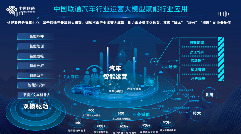 中国联通基于元景MaaS 2.0,以行业数据训练为基础,打造汽车行业数智运营大模型,面向具体场景以更低的门槛、更高的效率研发AI工具,提供全链路的AI车联网运营服务,旨在帮助车企实现运营过程的智能化、自动化和高效化,全面提升运营水平。