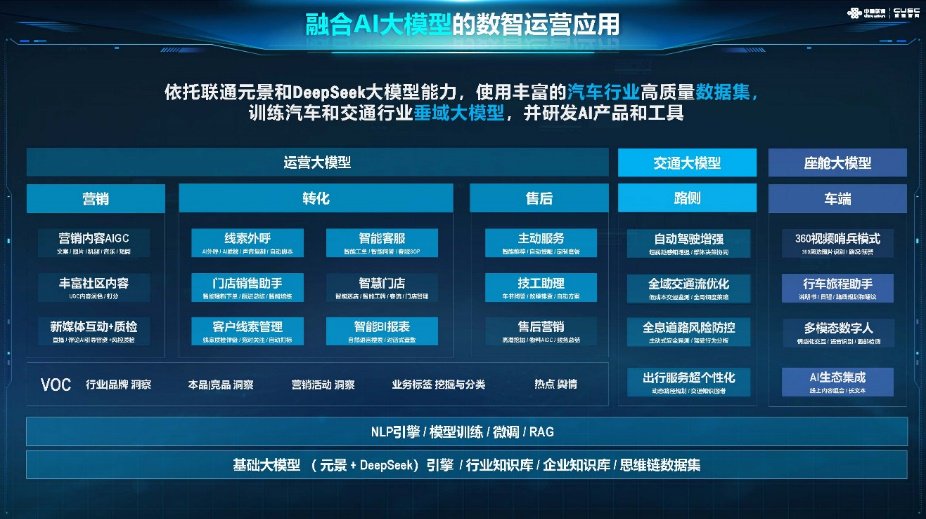 依托联通“元景”和DeepSeek大模型能力,联通智网科技结合十年积累的汽车行业数据以及具体场景,训练出运营大模型、座舱大模型、交通大模型,一方面帮助车企提质增效,另一方面提升车主出行体验。数据显示,AI大模型综合应用可帮助车企整体提升28%人效比。