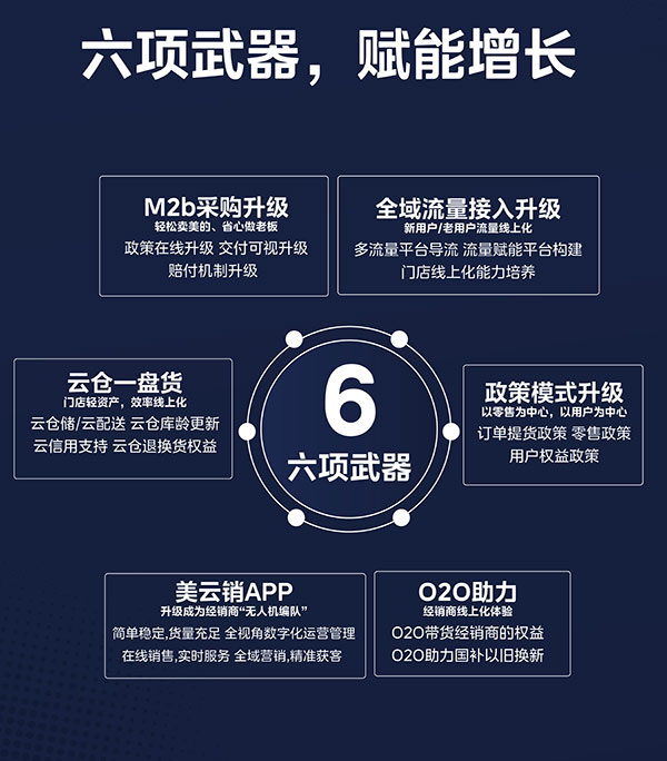 同时,美的采暖根据市场变化,为经销商打造了六项武器助力增长:M2b采购实现政策在线升级、交付可视升级、赔付机制升级;全域流量接入等升级,能通过多流量平台导流、流量赋能平台构建、门店线上化能力培养,助力经销商实现新用户、老用户流量线上化;云仓一盘货则能帮助经销商实现门店轻资产化,效率线上化,大幅降低库存压力;政策模式升级,经销商在提货时会享受到美的采暖提供的优惠,针对不同周期还会有相应的政策支持,同时用户选购时也会享受一定的福利政策;美云销APP能凭借全视角数字化运营的优势,降低门店运营、营销压力,快速提升业绩;O2O助力能让经销商在市场竞争中更具优势。