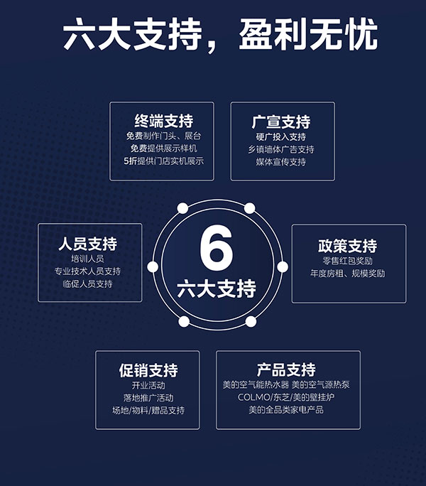 美的采暖将为全体经销商提供六大支持:为终端门店免费制作门头、展台,并优惠提供样机,帮助经销商打造终端形象;为经销商提供涵盖硬广、墙体广告等在内的广宣支持;还会为经销商提供专业的培训人员、技术人才,缓解用人压力,提升团队专业性;政策上,美的采暖设有零售红包等奖励、年度房租以及规模奖励;指导经销商开展促销、推广等活动,实现业绩提升;产品上,美的采暖全品类家电产品覆盖中高低端全市场供暖需求。