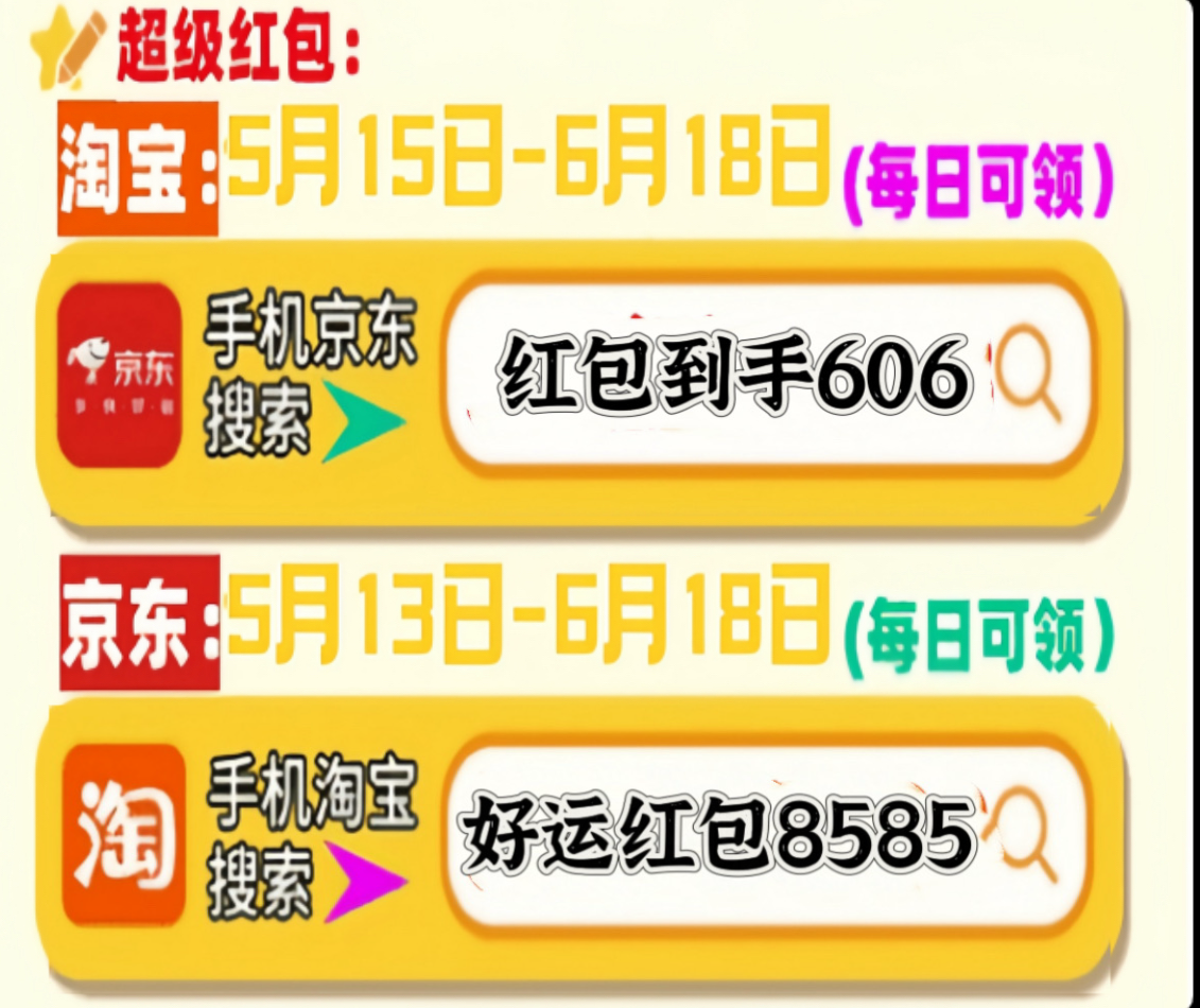 首先,划重点!今年京东的618最新红包口令是「红包到手606」,淘宝618最新红包口令是「好运红包8585」要记住!