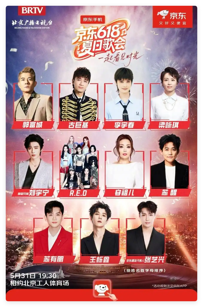 由京东和北京广播电视台联合主办的京东618夏日歌会正式官宣演唱会明星阵容,郭富城、古巨基、李宇春、梁咏琪、刘宇宁、R.E.D、容祖儿、苏醒、苏有朋、王栎鑫、张艺兴(按艺人首字母排序)会在此次歌会中惊喜亮相,并带来精彩表演。