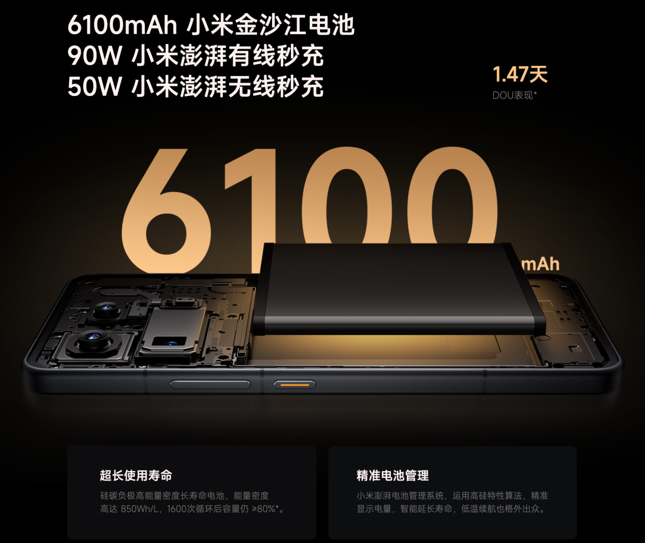 小米15S Pro搭载了一块6100mAh的大容量电池,这本身就是一个吸引眼球的数字。这块基于“硅负极技术”打造的金沙江电池,其能量密度达到了850Wh/L,这意味着在相同体积下,电池的储能能力更强。这种技术不仅提升了电池的续航潜力,还通过材料优化延长了电池的使用寿命——官方数据显示,即使经过1600次充放电循环,电池容量仍能保持在80%以上。