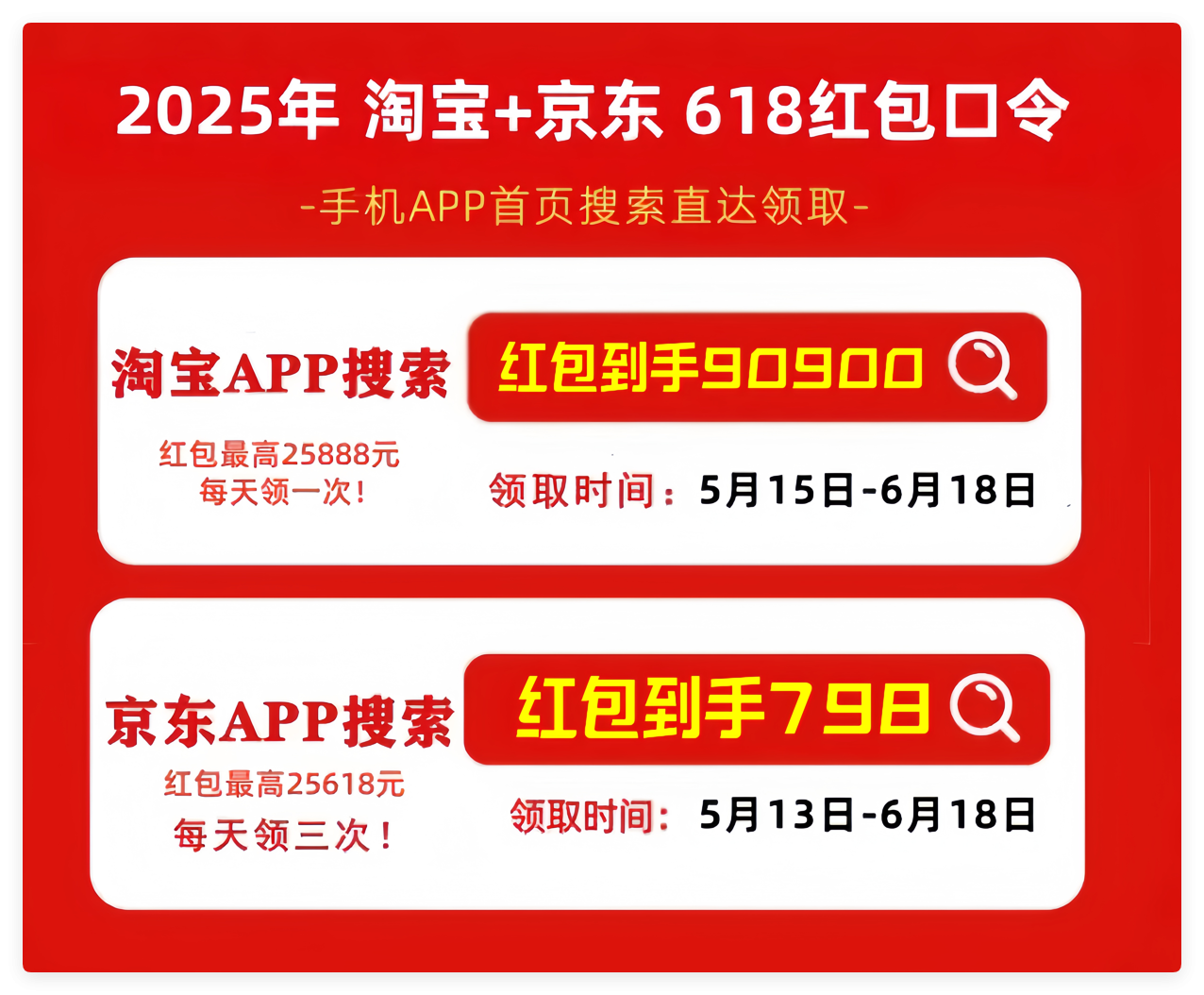 首先,划重点!2025年最新的京东618红包口令是「红包到手798」,天猫/淘宝618红包口令是「红包到手90900」记得每天去领,领的红包大小和你搜索的什么口令有关的!
