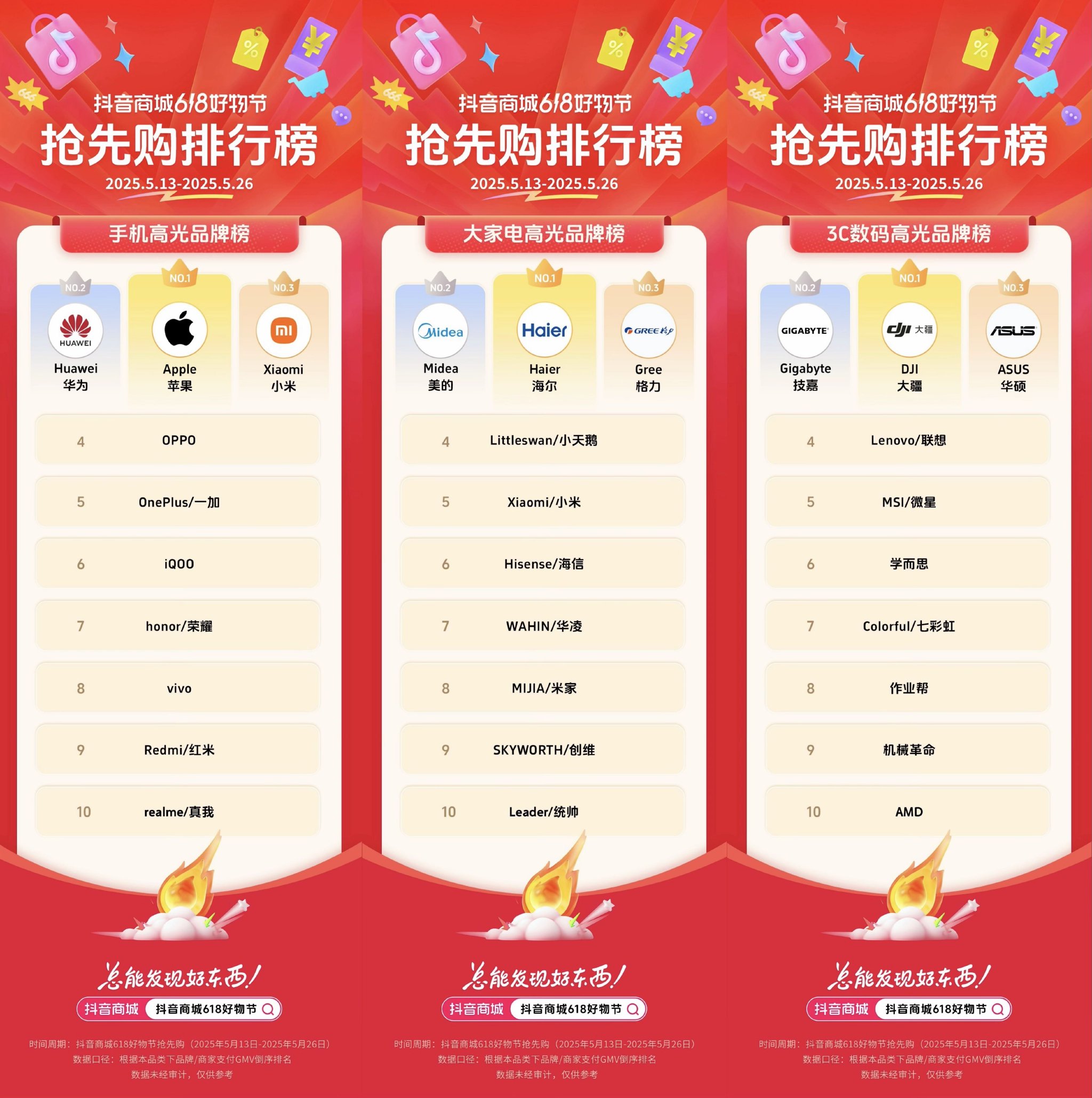 这种策略的有效性,在今年618抖音电商发布的榜单中得到了直观验证。5月13日-5月26日期间,抖音电商耐销品实现爆发式增长,海尔、美的、格力等品牌均位列品类榜单前列。