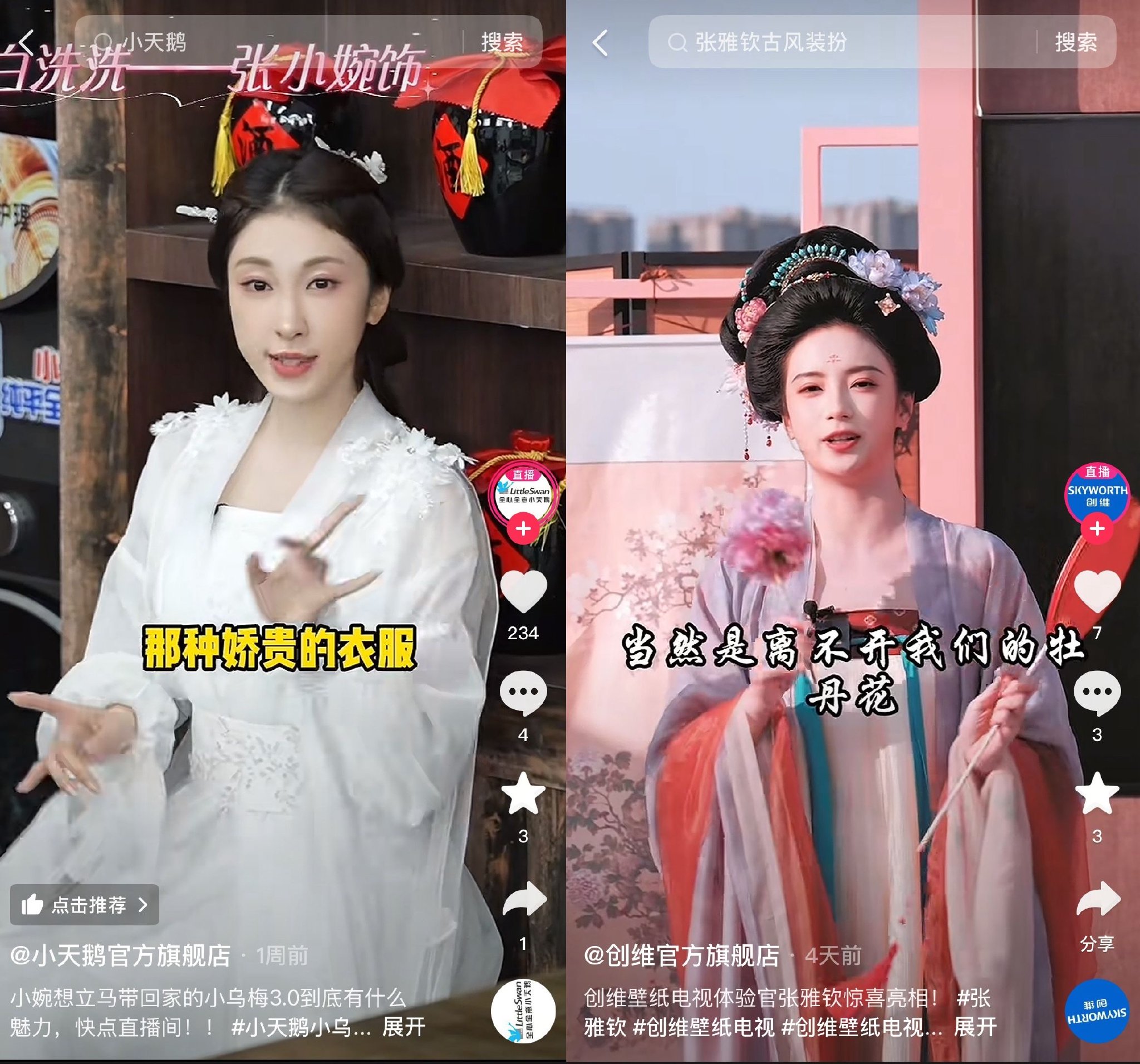 小天鹅联动演员张小婉,将直播间打造成古风。张小婉化身白蛇,与许仙因有关洗衣机的争执走进“乌梅客栈”,两人针对古今洗衣之法展开了一场爆笑PK。此前张小婉饰演的白蛇形象深入人心。这次小天鹅将此形象植入到自己的短剧创意中,让内容有趣有料的同时,既契合了产品卖点,也吸引到越来越多路人的关注。
