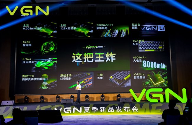 发布会上,VGN正式推出三款旗舰级新品,包括闪电磁轴键盘、霓虹磁轴键盘以及飞龙Y2电竞鼠标,全面展现了品牌在电竞外设领域的技术实力和创新理念。此外,行业领先轴体厂商TTC正牌科电董事长余正明先生、行业领先键盘方案商星闪悦动总经理周洪超以及近100名游戏选手、外设达人、数码博主等嘉宾也亲临现场,为VGN品牌加油助阵。