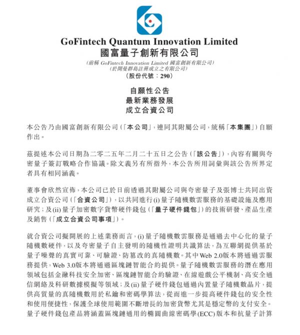 除作为圆币科技明牌股东的众安在线之外,据第三方资料显示,市场未关注到的还有另一家参与发起圆币科技的港股上市公司:国富量子创新有限公司(0290.HK),其作为创始股东领先布局——这家公司不仅深度绑定香港首个合规稳定币项目,更手握量子加密技术王牌,或将重构RWA赛道竞争逻辑。