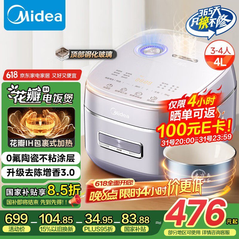 美的电饭煲家用4L青瓷内胆IH加热智能预约315元