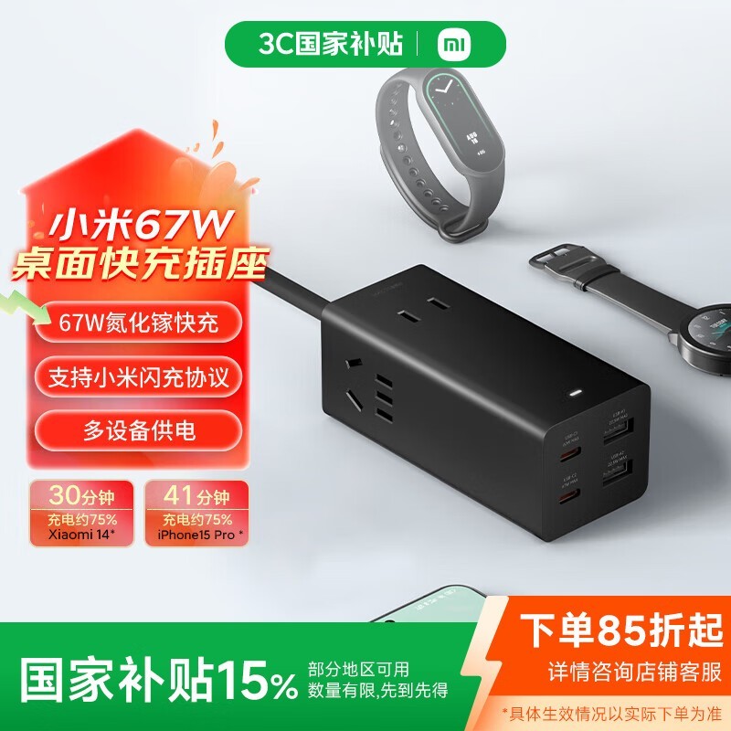 小米67W桌面快充插座 黑色限时特惠98.14元